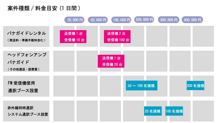 送信機システム、受信機(参加者人数)、箱型通訳ブース、オペレーターを含む諸経費目安です。