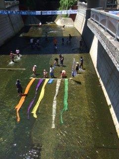 ズボンの裾をめくり、親子が裸足で神田川に入って、楽しそうに染色を行っていました。