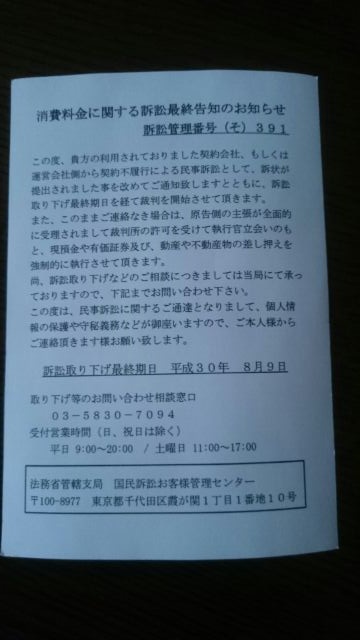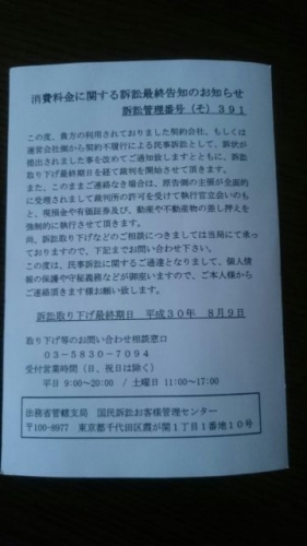 先日、「訴訟最終告知のお知らせ」と書かれたこんなハガキが届きました。